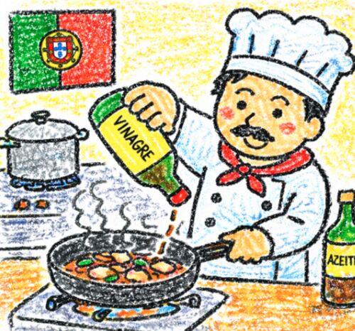 ポルトガル語(ヨーロッパのポルトガル語)で「読める力」を伸ばしたい日本人学習者向け、vinagre(お酢)をテーマにした長文読解コンテンツ。本文では、ポルトガルにおけるお酢の歴史(vinho が azedar して酸味が生まれる話)、食卓での位置づけ(salada …